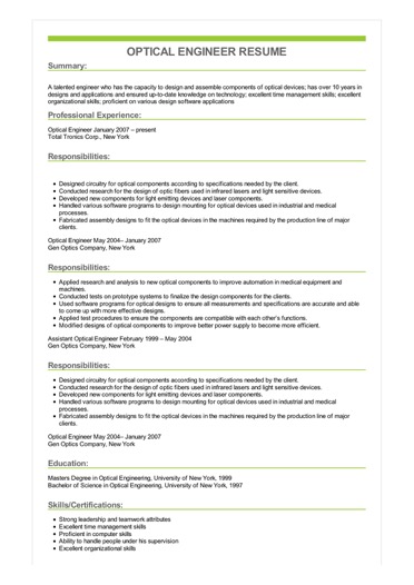 Sample Optical Engineer Resume